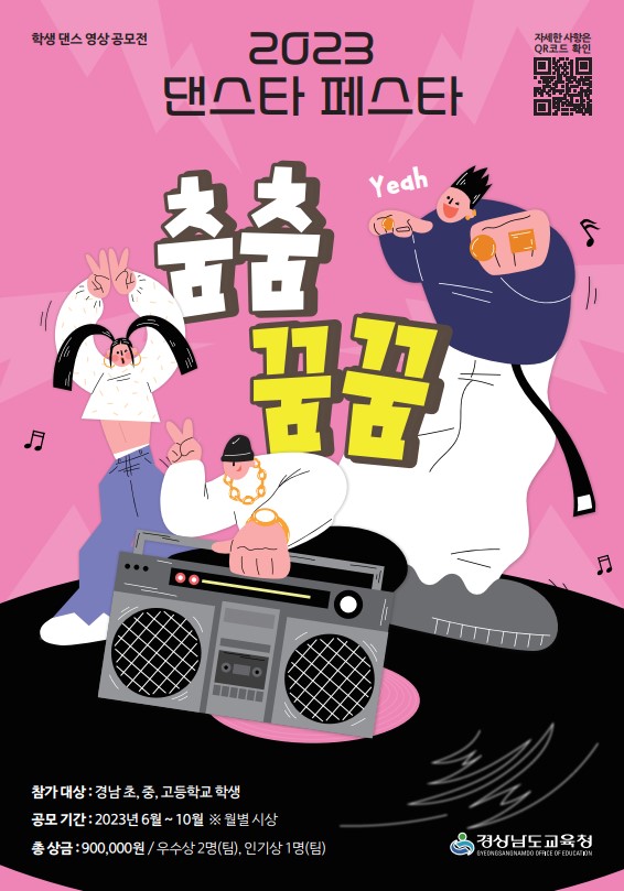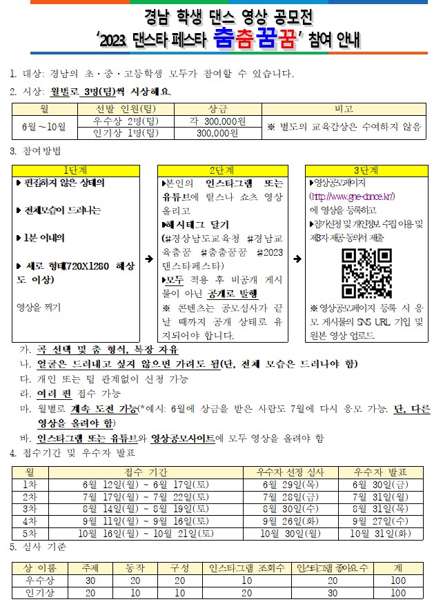 가. 공모전 명칭: 2023. 댄스타 페스타 춤춤꿈꿈 나. 공모기간 : 6월~10월(월별 우수자 3명(팀) 상금 지급) 다. 참여대상 : 경남 초등학생, 중학생, 고등학생 라. 상금 : 1인(팀)당 300,000원, 월별 총 900,000원